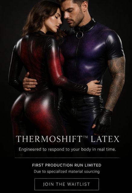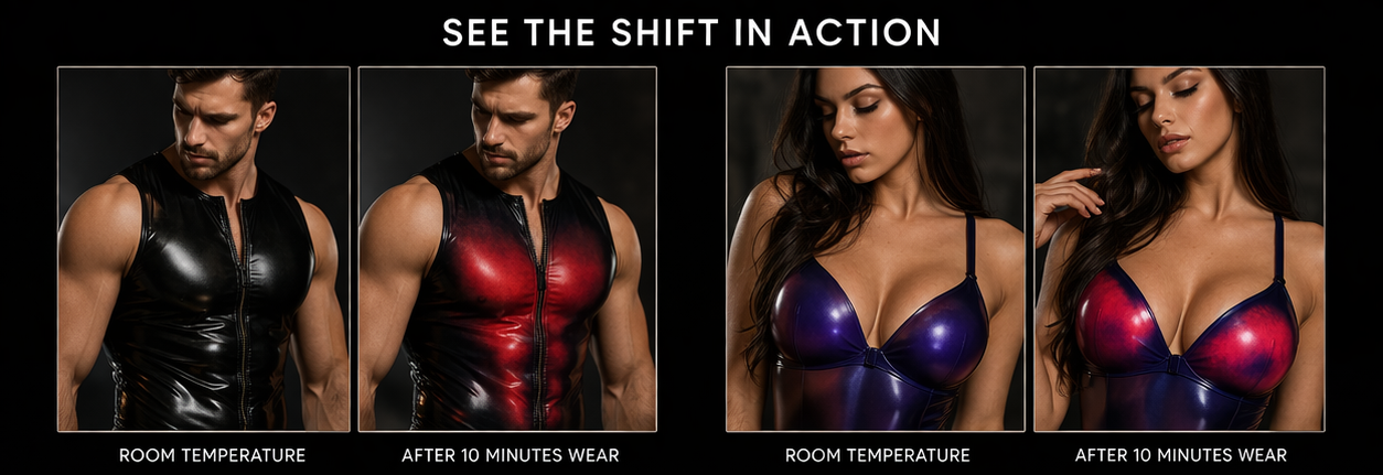 ThermoShift™ Latex is crafted using advanced pigment technology that reacts subtly to body heat and touch—creating a living, shifting finish unique to every wearer.
