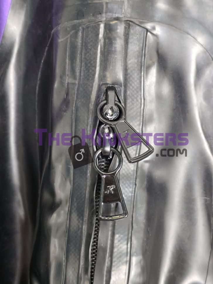 Includes: Kink Projects "Double O" Catsuit in Black with Purple Trim in custom size Small - includes wrist gauntlets, foot stirrups, shoulder zips and crotch zip with locable zip heads.