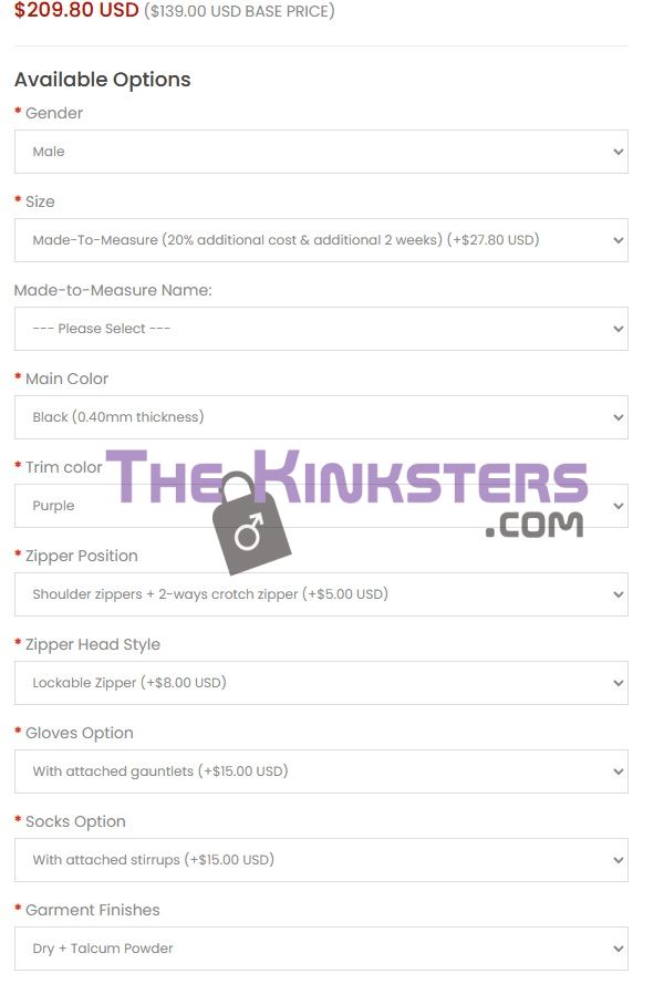 A stunning .4mm rubber catsuit from Kink Projects in custom sizing (equivelant to a small - see sizing below).